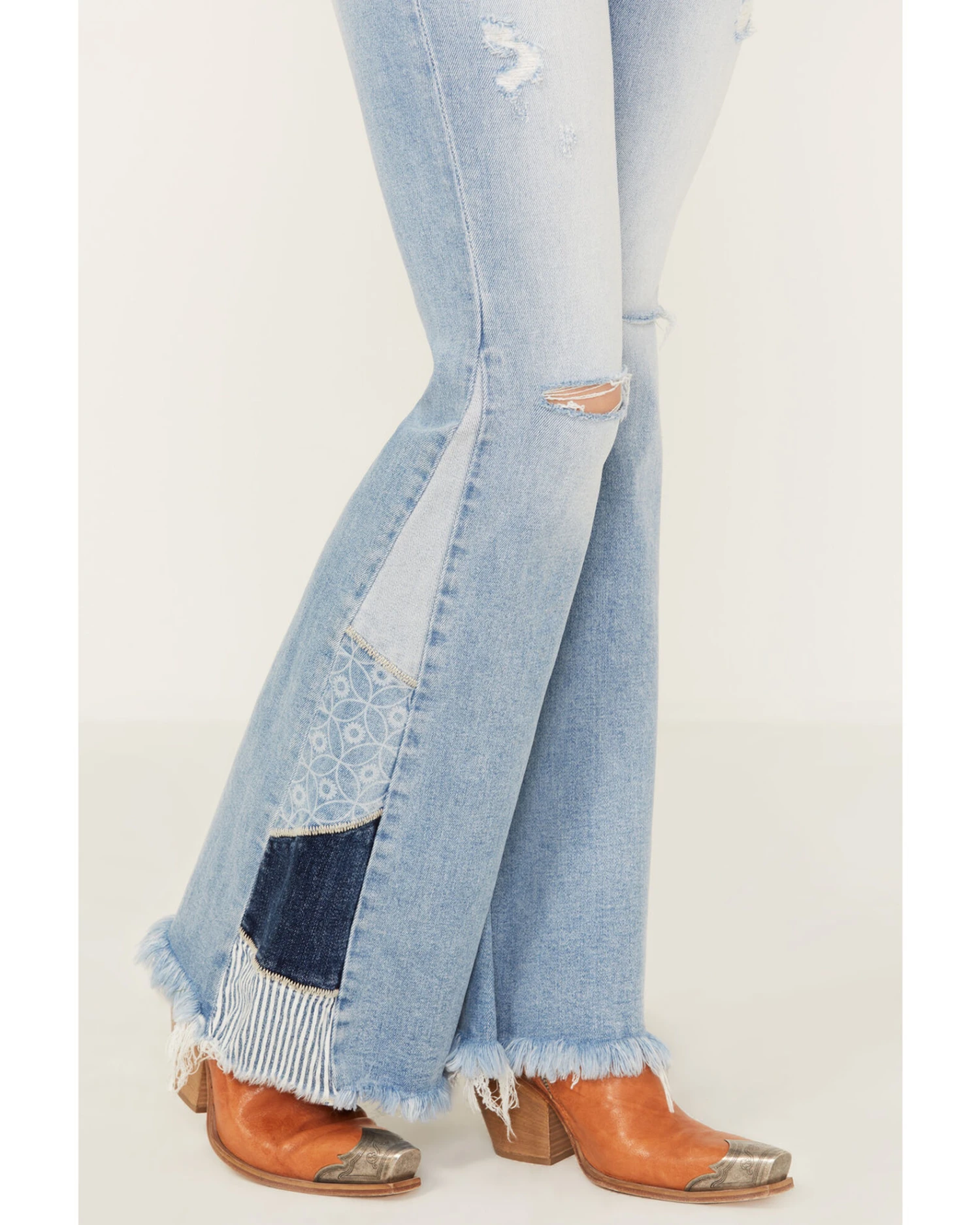 Ceros Women’s Light Wash High Rise Destructed Patchwork Flare Stretch Jeans