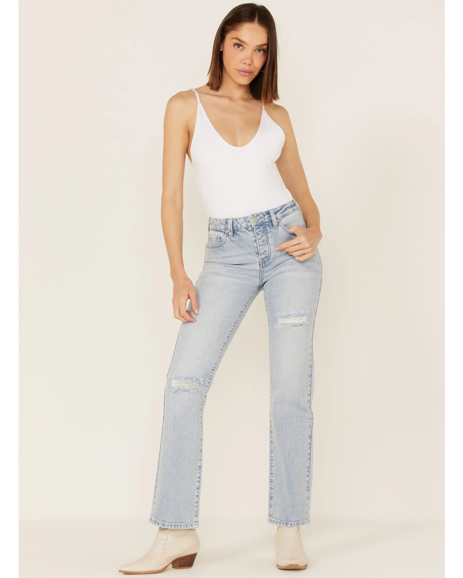 Cleo + Wolf Women’s Light Wash High Rise Distressed Straight Jeans