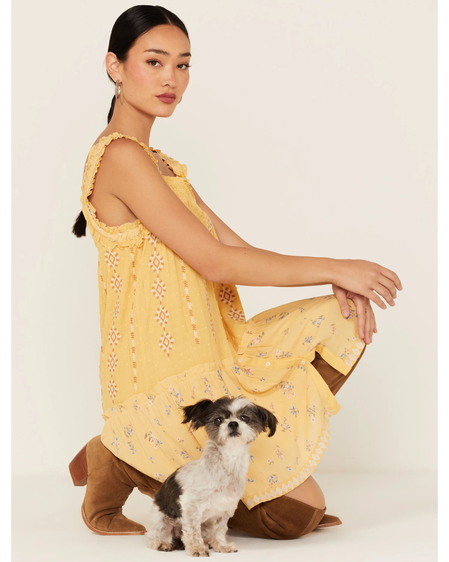- Mustard swiss dot material with embroidered diamond shape Southwestern details, accent floral fabric and metallic gold threading