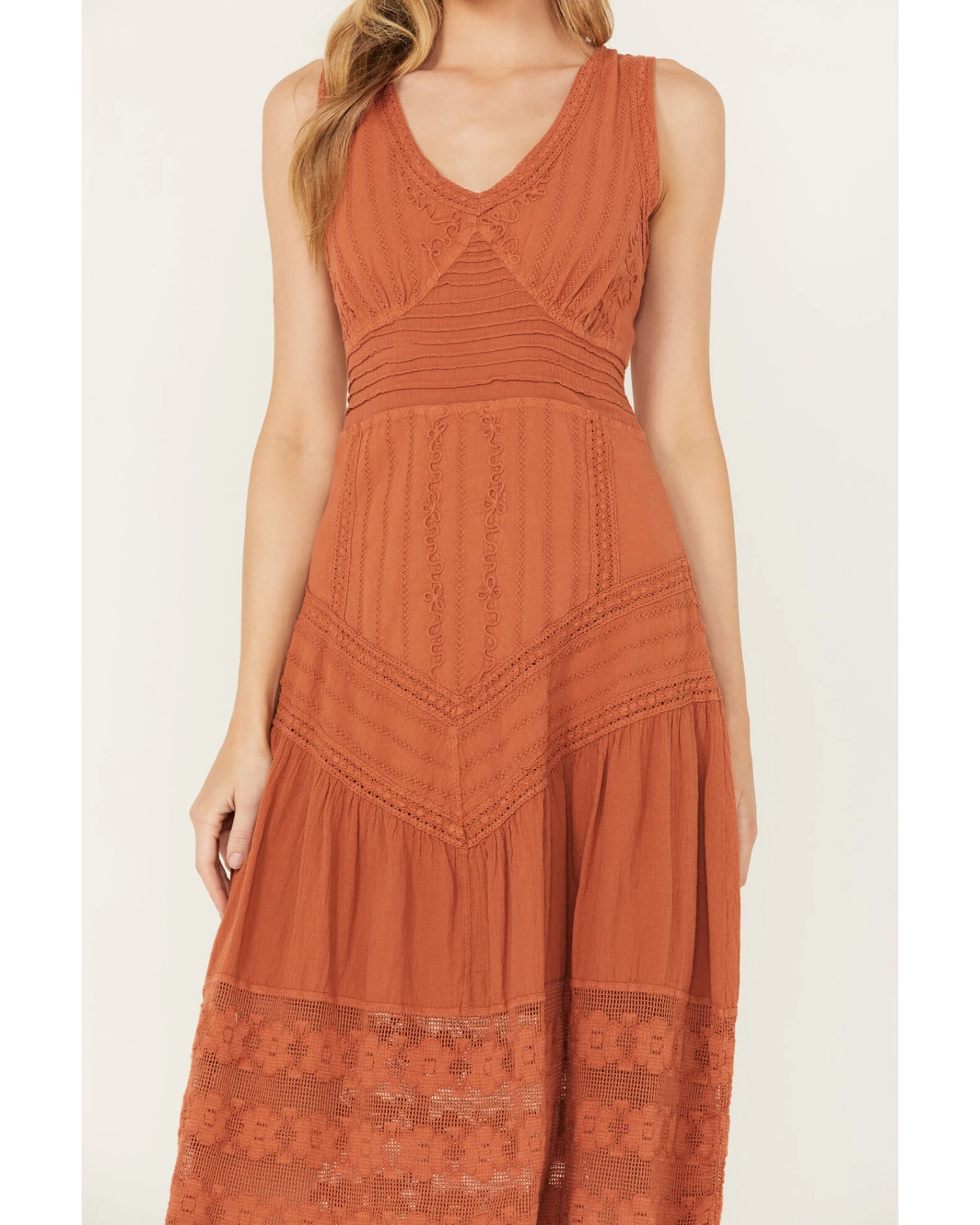 - Solid rust design with embroidered details throughout