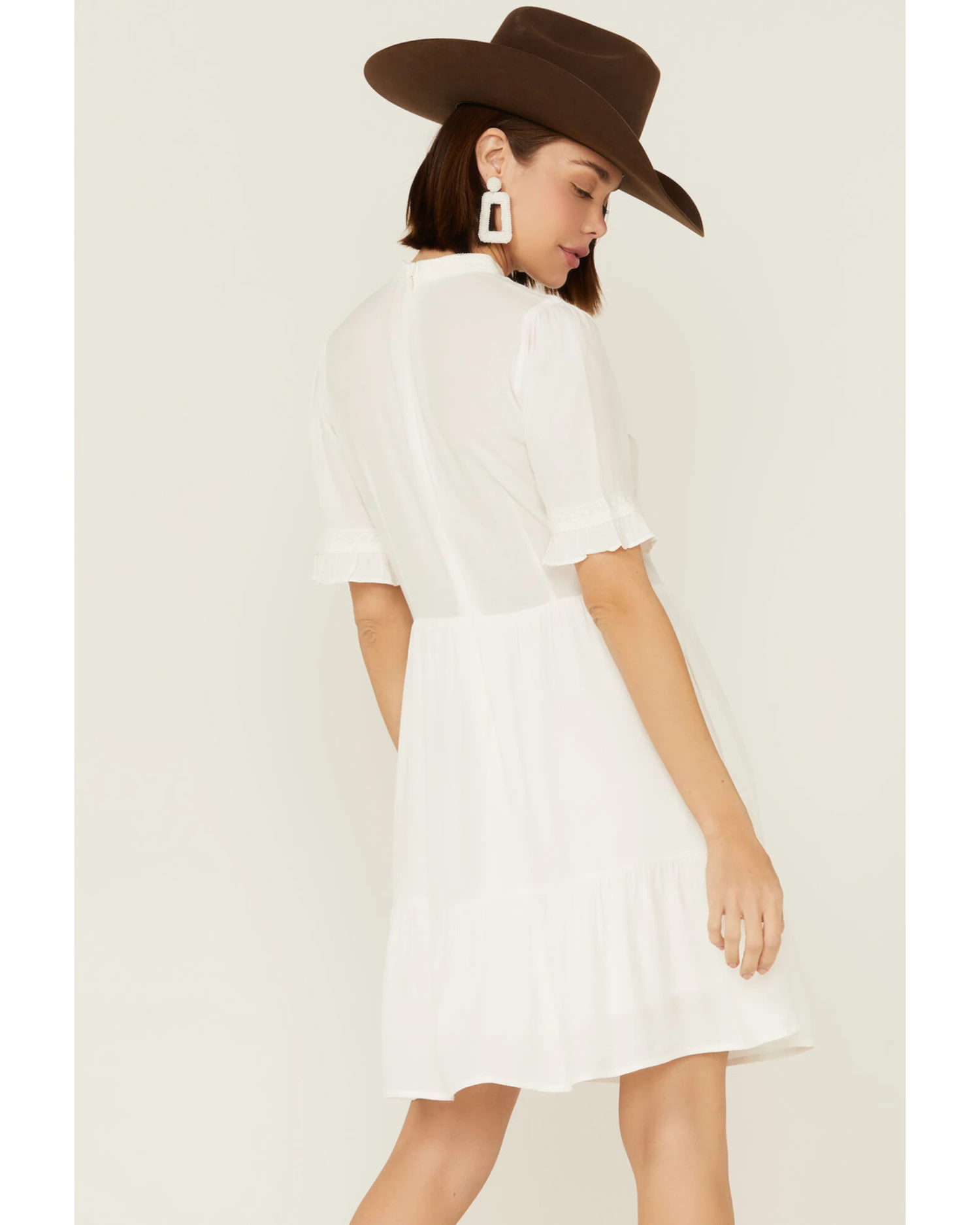 - Above-the-knee length with ruffle flounce hem