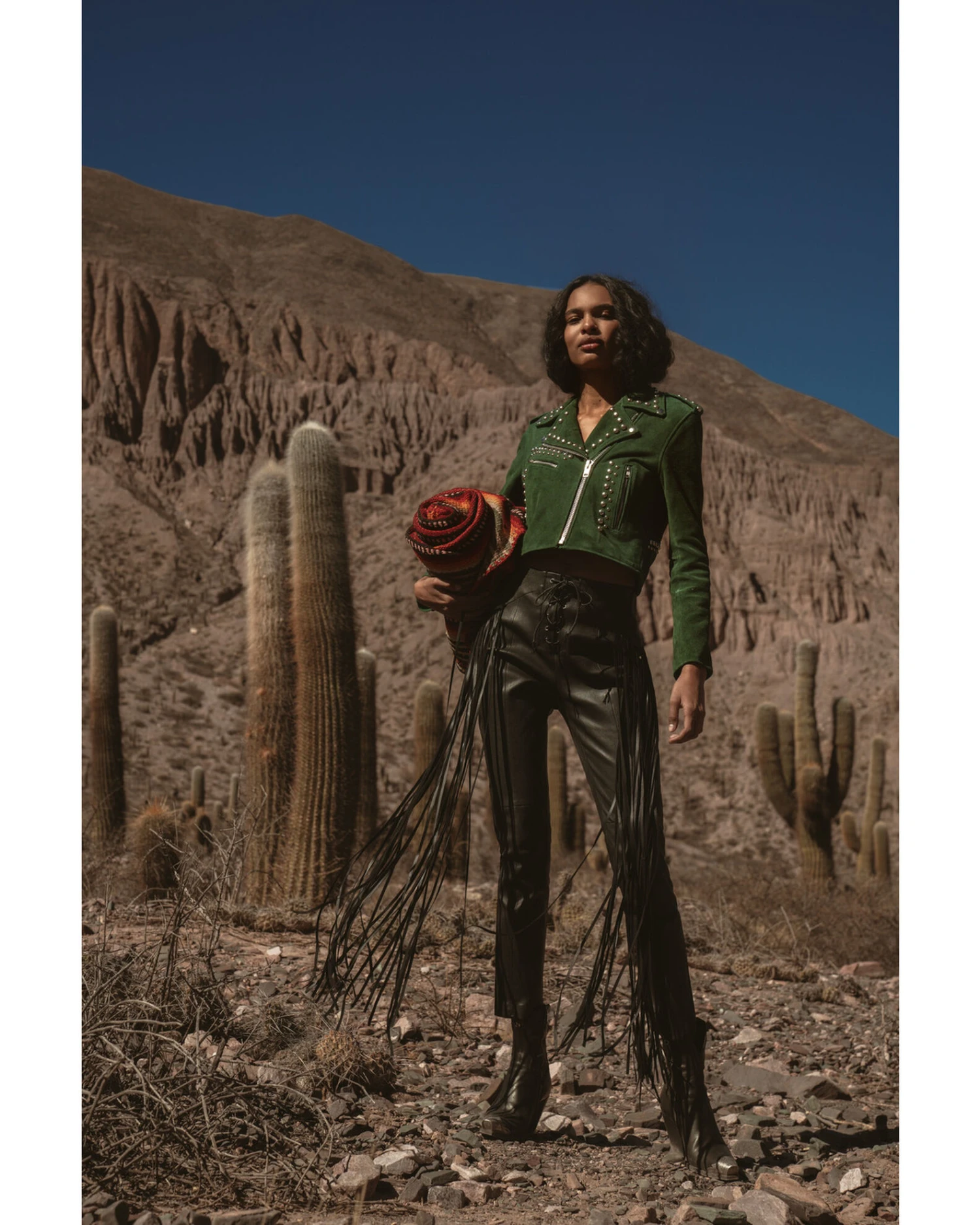 - Black leather with long fringe detail on faux pockets